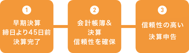 - 早期に決算業務を行い締日より45日で決算を完了させます【実績90%超】