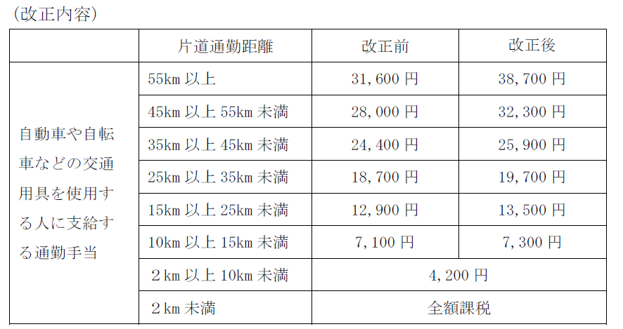 燃料代を含む物価高騰対策の一環として、マイカーや自転車などで通勤する従業員への通勤手当の「所得税の非課税限度額」が下記のように令和7年4月1日に遡って改正されました。